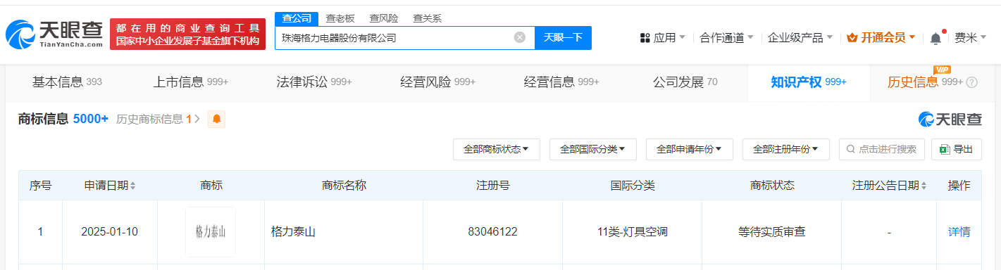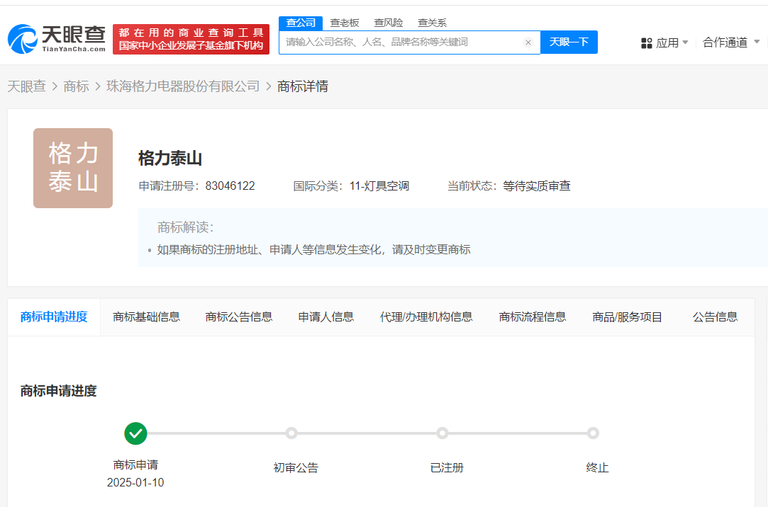 每经AI快讯,天眼查知识产权信息显示,近日,格力电器申请注册一枚“格力泰山”商标,国际分类为灯具空调,当前商标状态为等待实质审查。